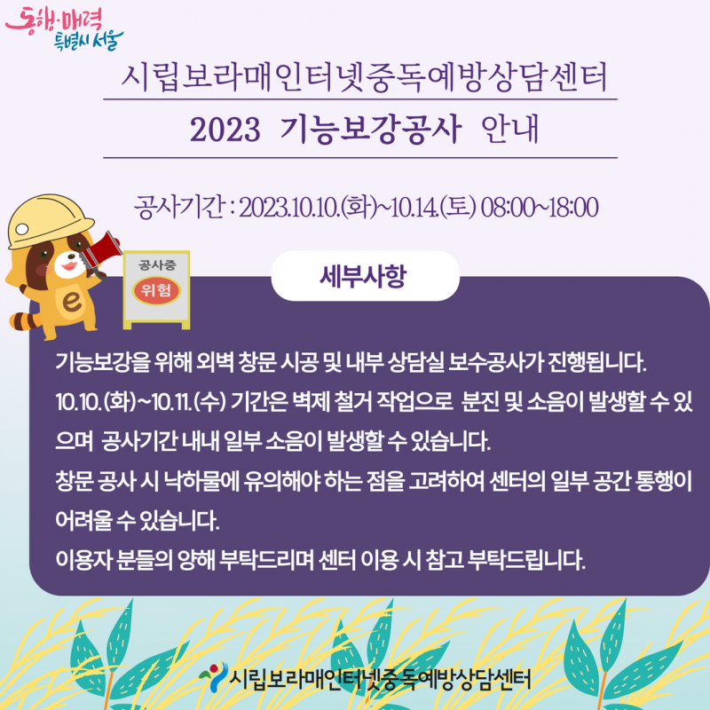 | ½Ã¸³º¸¶ó¸ÅÀÎÅͳÝÁßµ¶¿¹¹æ»ó´ã¼¾ÅÍ 2023³â ±â´Éº¸° °ø»ç ÁøÇà ¾È³» | |