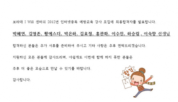 | 2012³â ÀÎÅͳÝÁßµ¶ ¿¹¹æ±³À° °»ç ÃÖÁ¾ ÇÕ°ÝÀÚ °øÁö | |