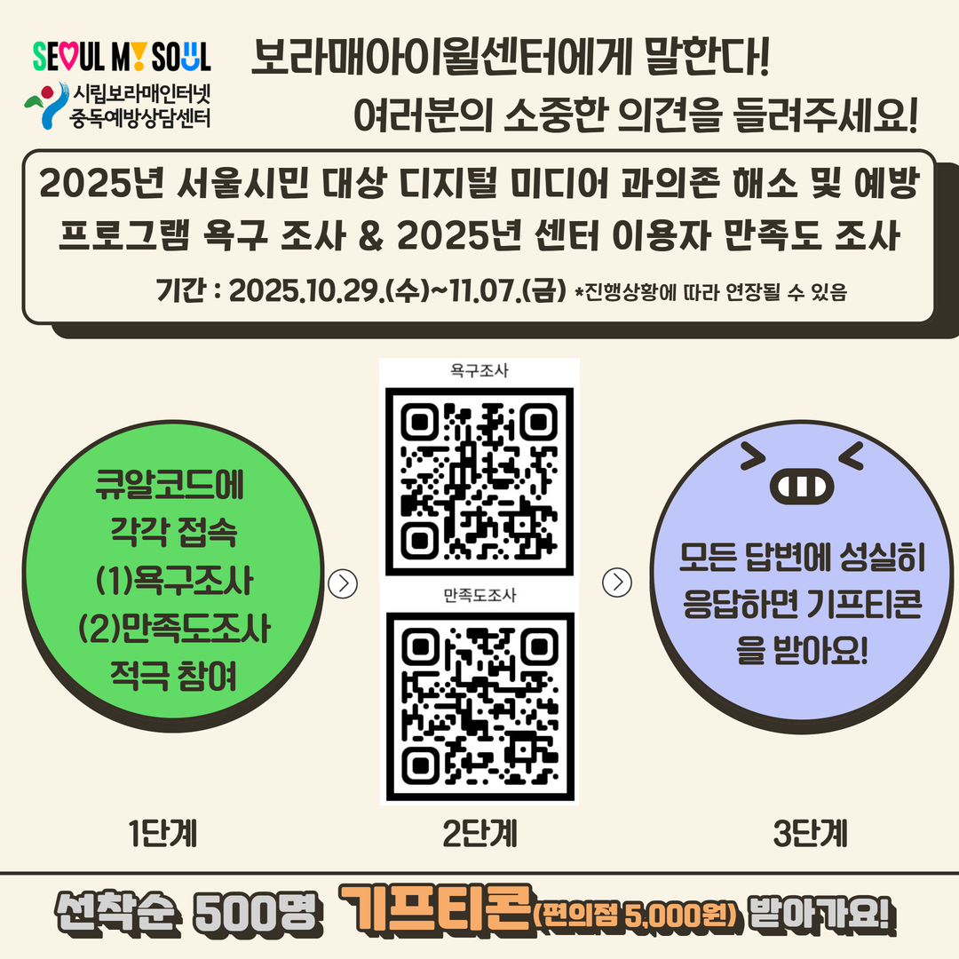 | 2025 ¼¿ï½Ã¹Î ´ë»ó ÇÁ·Î±×·¥ ¿å±¸Á¶»ç & ¼¾ÅÍ ÀÌ¿ëÀÚ ´ë»ó ¸¸Á·µµÁ¶»ç ¾È³»(~11/7±îÁö)⭐±âÇÁƼÄÜ ÁõÁ¤ ¸¶°¨⭐ | |